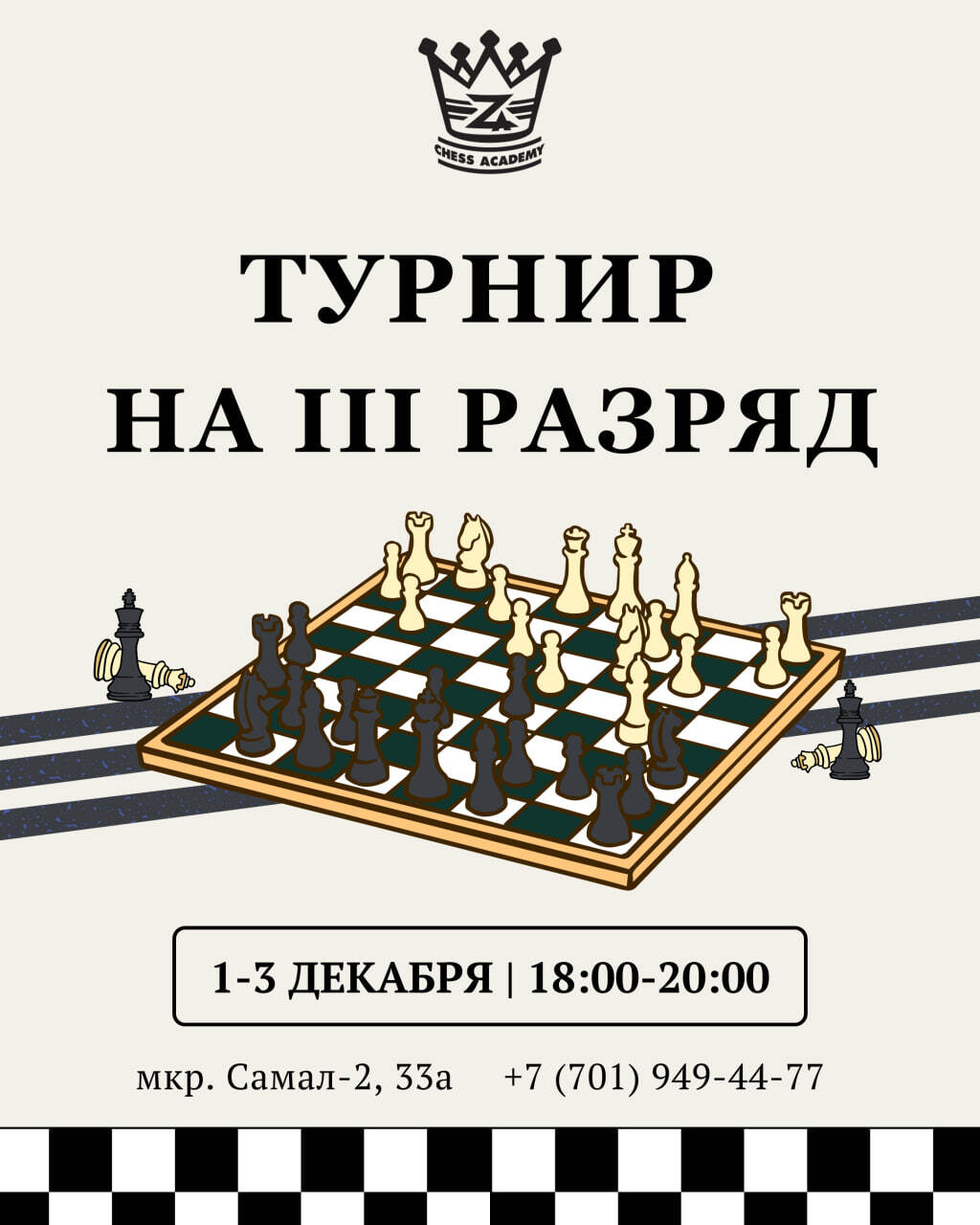 С 1 по 3 декабря в Академии шахмат Жансаи Абдумалик пройдет квалификационный турнир на III разряд. К участию в турнире допускаются шахматисты, имеющие IV разряд.